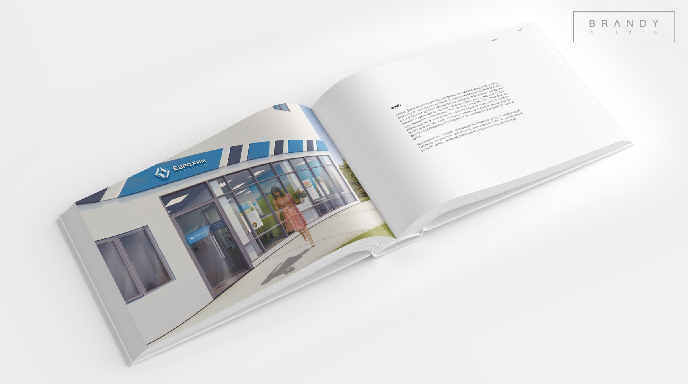 To create a unified look for all EuroChem Agroset customer centers, a pattern was developed that allows a single graphic element to adapt to all building types and harmoniously encircle their façades. The pattern's shape mimics the angle of the mineral—the logo's graphic element.