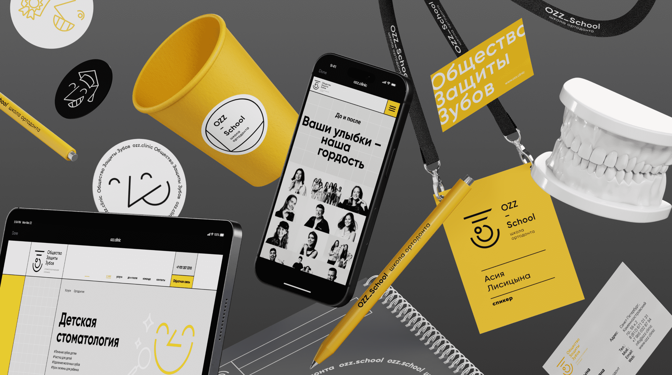 The clinic's visual concept was further developed through the brand's printed materials, navigation and information systems, website, and the implementation of the clinic's subbrand, the OZZ School orthodontic school. Key elements of this concept included social media posts, handouts and accompanying materials, and merchandise.