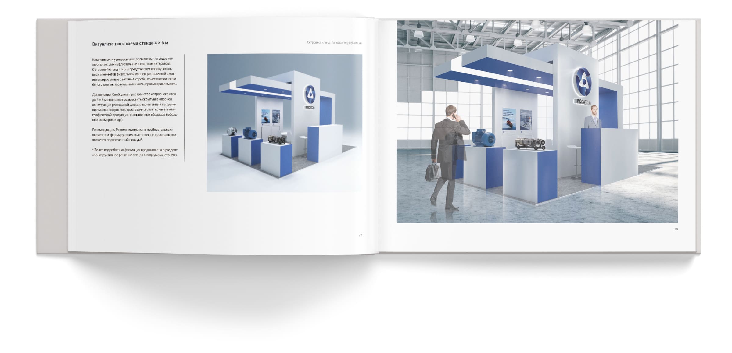 The stand's key feature is an arch, extending like a bridge, symbolizing unity and movement toward the new. The guidelines included diagrams of each stand in various projections, equipment drawings, working documentation, materials, multimedia, furniture, lighting, mobile structures, promotional clothing, and a calculation of the total construction costs.